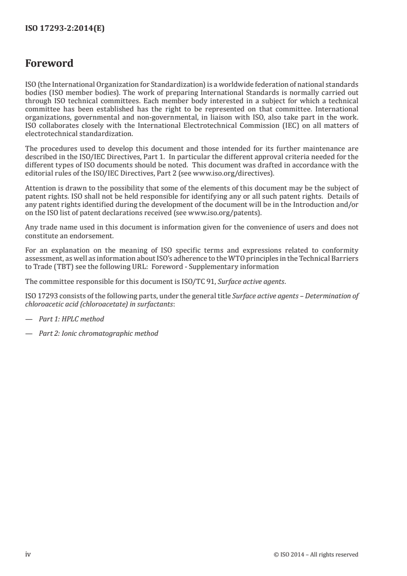 ISO 17293-2:2014 - Surface active agents — Determination of chloroacetic acid (chloroacetate) in surfactants — Part 2: Ionic chromatographic method Released:3/19/2014