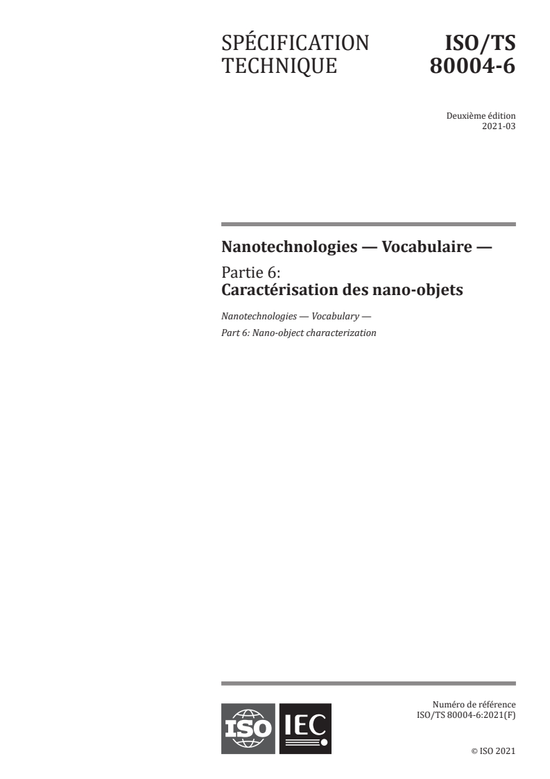 ISO/TS 80004-6:2021 - Nanotechnologies — Vocabulaire — Partie 6: Caractérisation des nano-objets Released:3/23/2021