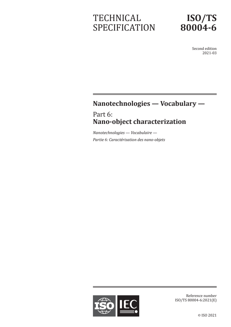 ISO/TS 80004-6:2021 - Nanotechnologies — Vocabulary — Part 6: Nano-object characterization Released:3/23/2021