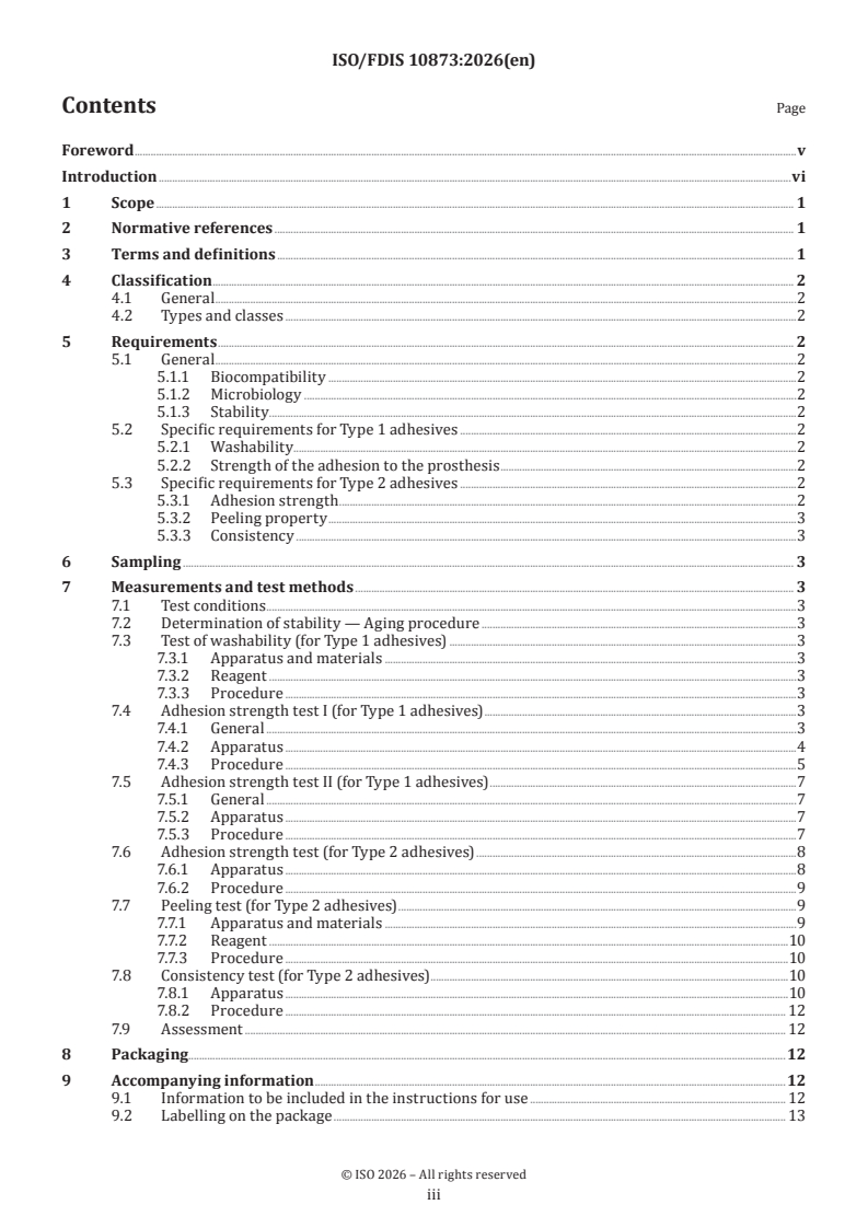 ISO/FDIS 10873:2025 is an international standard established by the International Organization for Standardization (ISO) that addresses denture adhesives used by consumers who wear removable dentures. This standard classifies denture adhesives, specifies essential requirements and test methods, and defines the necessary user instructions for these products. ISO 10873 focuses exclusively on consumer-use denture adhesives, distinctly excluding dental lining materials prescribed or applied by dental professionals. The third edition of the standard refines previous versions by updating requirements and removing the pH value specification to reflect current best practices.