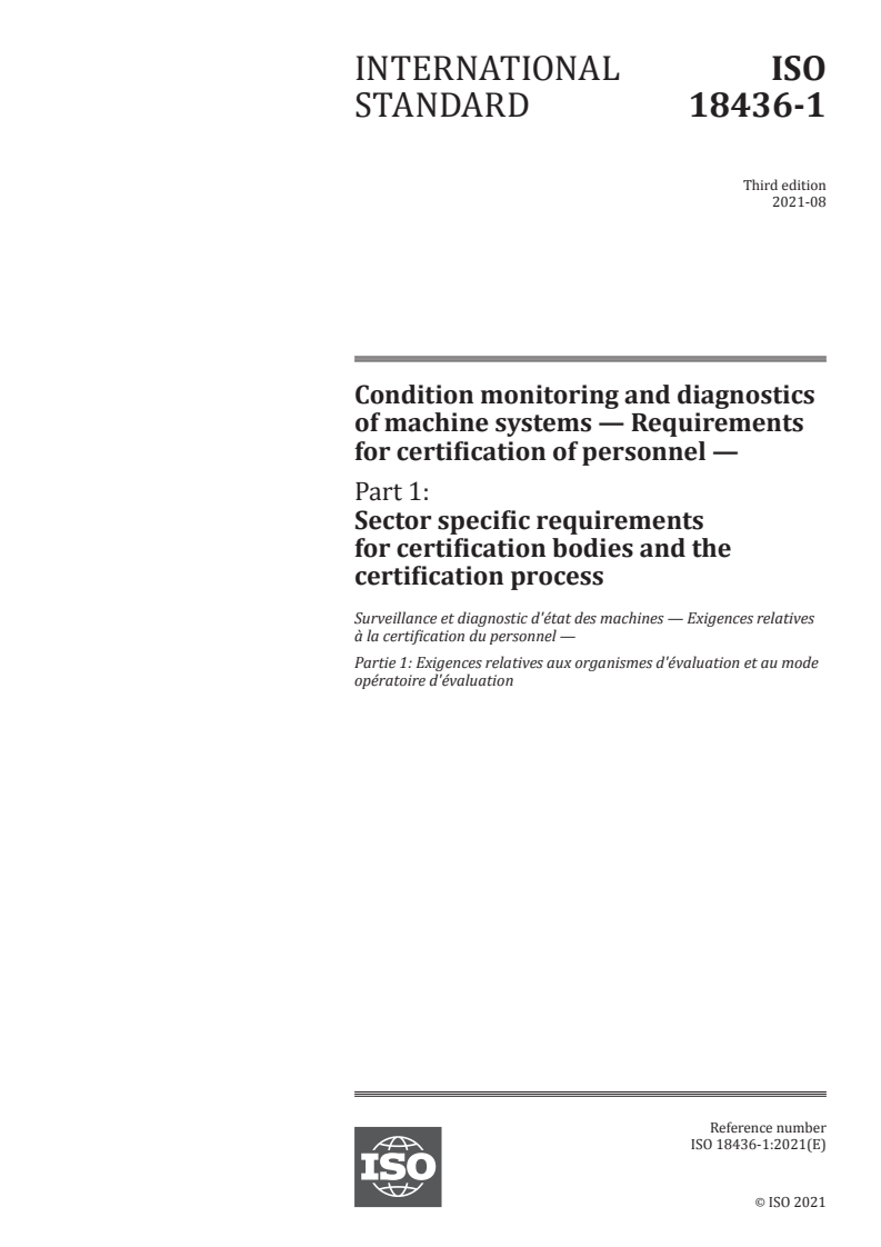 ISO 18436-1:2021 is an international standard providing sector-specific requirements for certification bodies and the certification process related to personnel involved in condition monitoring and diagnostics of machine systems. This third edition, published by ISO, defines the framework for organizations conducting conformity assessments of personnel who monitor machinery conditions, identify faults, and recommend corrective actions. The standard complements the general requirements established in ISO/IEC 17000 and ISO/IEC 17024, focusing specifically on certification schemes for professionals working within non-intrusive machine condition monitoring technologies.