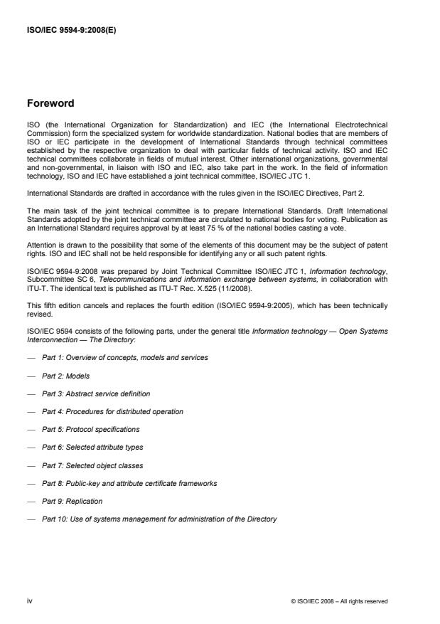 ISO/IEC 9594-9:2008 is a standard published by the International Organization for Standardization (ISO). Its full title is "Information technology — Open Systems Interconnection — The Directory: Replication — Part 9:". This standard covers: ISO/IEC 9594-9:2008 specifies a shadow service which DSAs may use to replicate Directory information. The service allows Directory information to be replicated among DSAs to improve service to Directory users. The shadowed information is updated, using the defined protocol, thereby improving the service provided to users of the Directory.