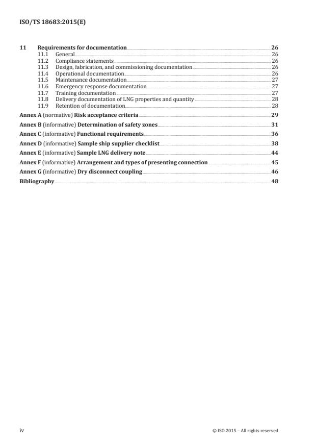 ISO/TS 18683:2015 is a technical specification published by the International Organization for Standardization (ISO). Its full title is "Guidelines for systems and installations for supply of LNG as fuel to ships". This standard covers: ISO/TS 18683:2015 gives guidance on the minimum requirements for the design and operation of the LNG bunkering facility, including the interface between the LNG supply facilities and receiving ship as shown in Figure 1. ISO/TS 18683:2015 provides requirements and recommendations for operator and crew competency training, for the roles and responsibilities of the ship crew and bunkering personnel during LNG bunkering operations, and the functional requirements for equipment necessary to ensure safe LNG bunkering operations of LNG fuelled ships. ISO/TS 18683:2015 is applicable to bunkering of both seagoing and inland trading vessels. It covers LNG bunkering from shore or ship LNG supply facilities, as shown in Figure 1 and described in Clause 4, and addresses all operations required such as inerting, gassing up, cooling down, and loading.