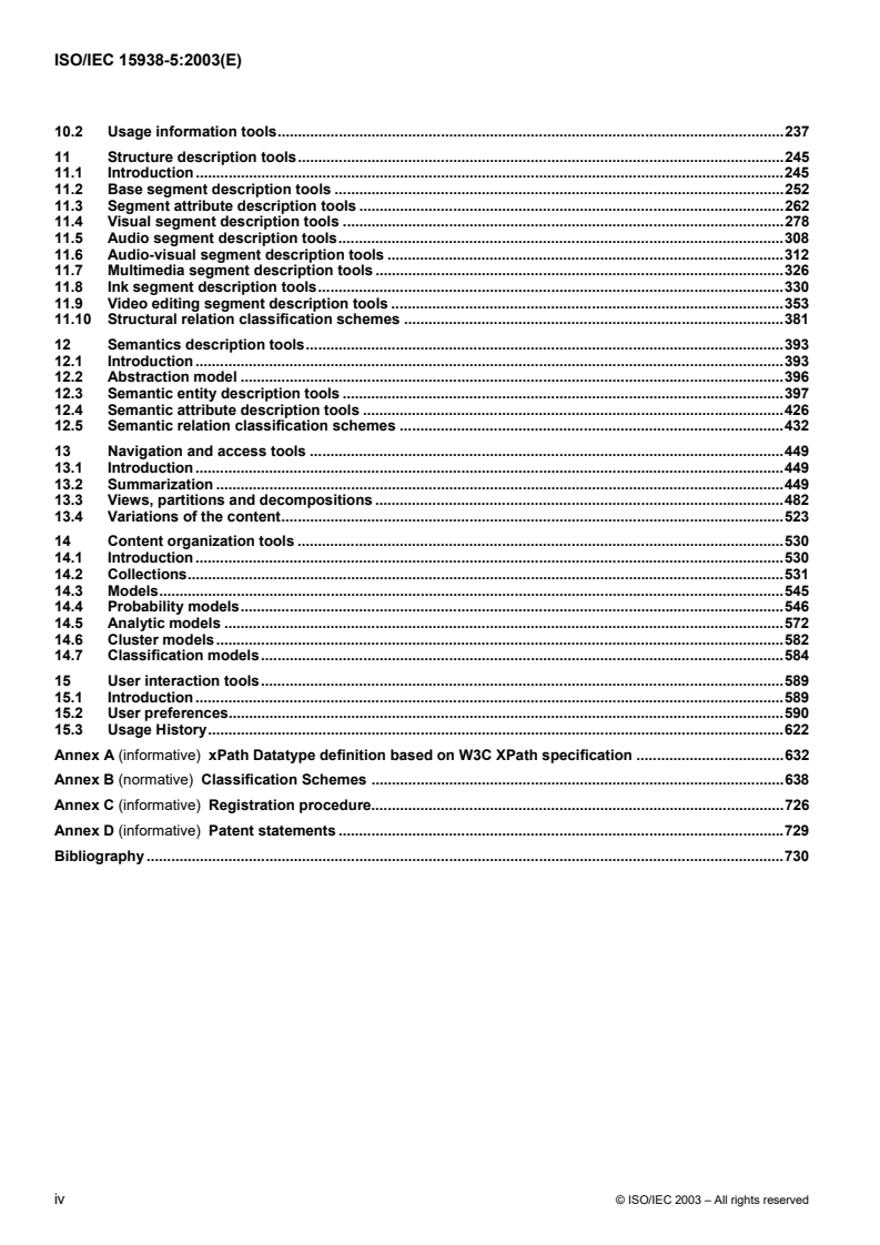ISO/IEC 15938-5:2003 specifies a metadata system for describing multimedia content. ISO/IEC 15938-5:2003 specifies the Multimedia Description Schemes (MDS) description tools (Description Schemes, Descriptors, and datatypes) that comprise ISO/IEC 15938-5:2003 by specifying the normative syntax of each description tool using Description Definition Language (DDL) (see ISO/IEC 15938-2) and the normative semantics including semantics of each component of each description tool (attributes and elements). ISO/IEC 15938-5:2003 also provides informative examples that illustrate the instantiation of description tools in creating descriptions conforming to ISO/IEC 15938-5:2003. ISO/IEC 15938-5:2003 defines the following basic elements: schema tools (the root element, top-level types, description metadata, and packages), basic datatypes (integers, reals, vectors, matrices), linking and media localization tools (spatial and temporal localization), basic description tools (language, text, classification schemes). ISO/IEC 15938-5:2003 defines the following content description tools, which describe the features of the multimedia content and the immutable metadata related to the multimedia content: structure description tools (spatio-temporal segments of multimedia content) and semantic description tools ("real-world" semantics related to or captured by the multimedia content, including objects, events, concepts, and so forth). ISO/IEC 15938-5:2003 defines additionally the following description tools for content metadata: media description (storage format, encoding), creation and production (title, creator, classification, purpose), and usage (access rights, publication). The content description and metadata tools are related in the sense that the content description tools use the content metadata tools. For example, a description of creation and production or media information can be attached to an individual video or video segment in order to describe the structure and creation and production of the multimedia content. ISO/IEC 15938-5:2003 also defines description tools for navigation and access (browsing, summarization), content organization (collections and models), and user interaction (user preferences pertaining to consumption of multimedia and usage history). Finally, ISO/IEC 15938-5:2003 defines classification schemes, which organize terms that are used by the description tools.