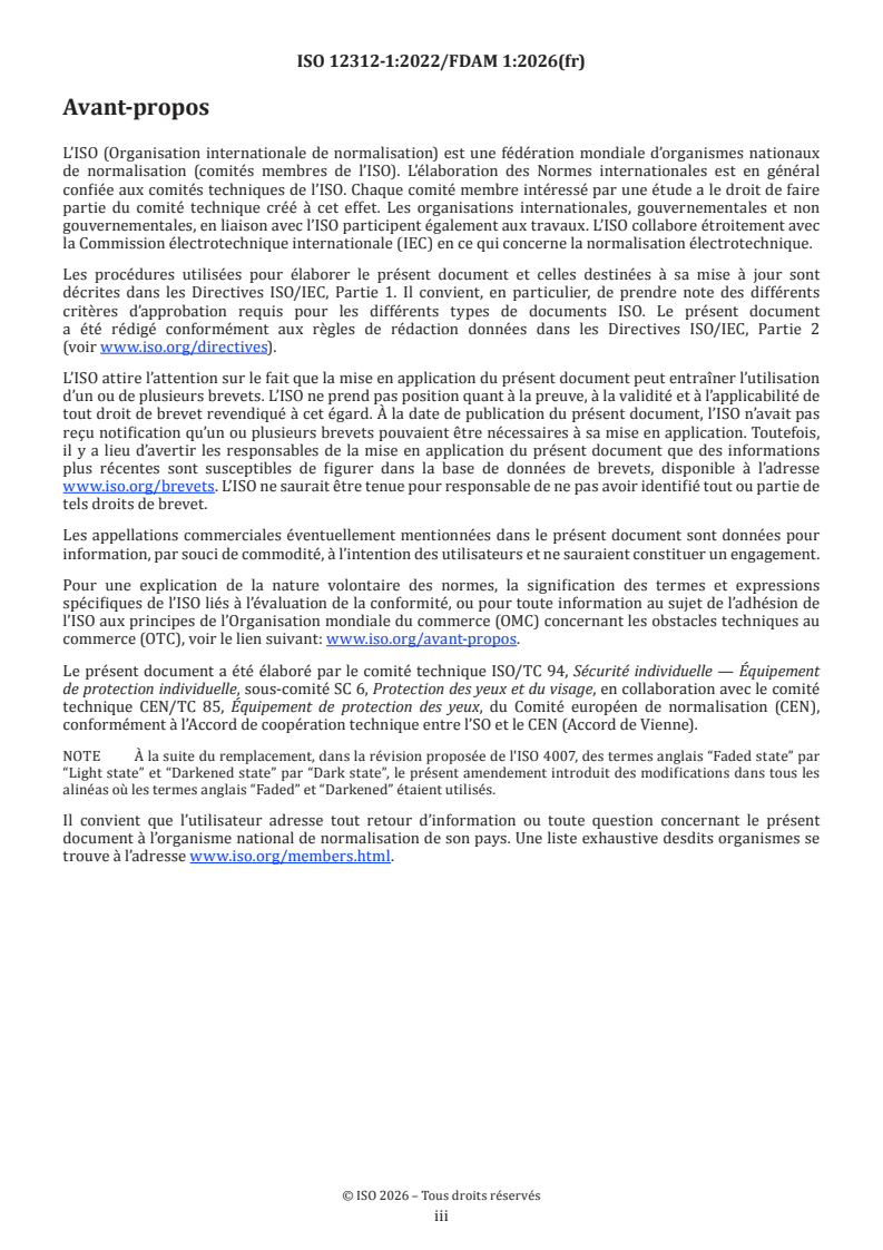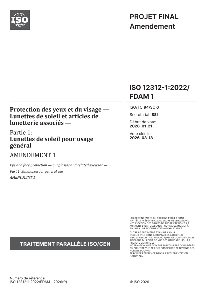 ISO 12312-1:2022/FDAmd 1 - Protection des yeux et du visage — Lunettes de soleil et articles de lunetterie associés — Partie 1: Lunettes de soleil pour usage général — Amendement 1 Released:23. 01. 2026