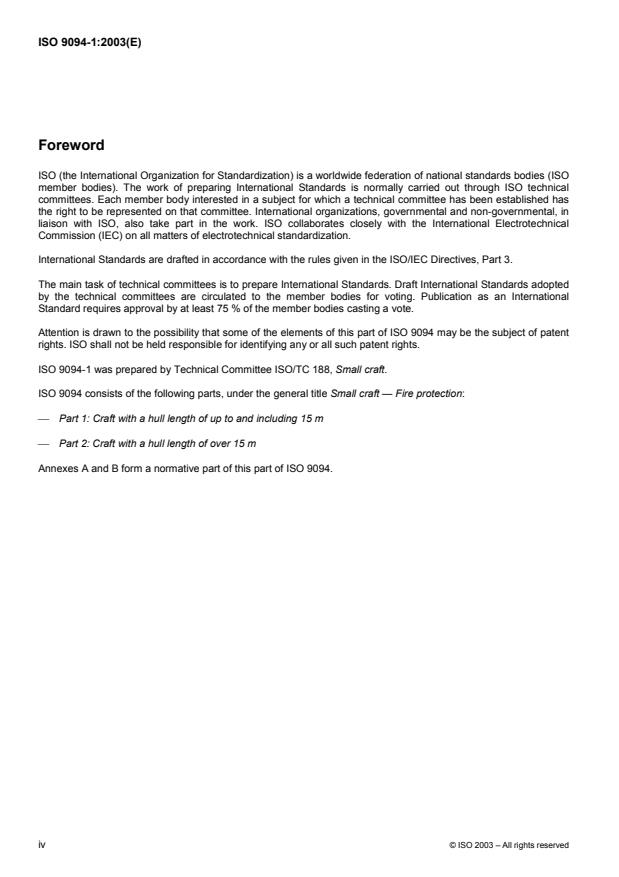 ISO 9094-1:2003 defines procedures to achieve a practical degree of fire protection, specifies portable fire-fighting equipment and sets requirements for fixed fire-fighting systems. It applies to small craft of all types with a hull length not exceeding 15 m. For small craft with a hull length greater than 15 m, ISO 9094-2 applies. Personal watercraft are excluded from the scope of ISO 9094-1:2003.