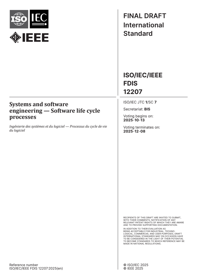 ISO/IEC/IEEE FDIS 12207 - Systems and software engineering — Software life cycle processes Released:9/29/2025