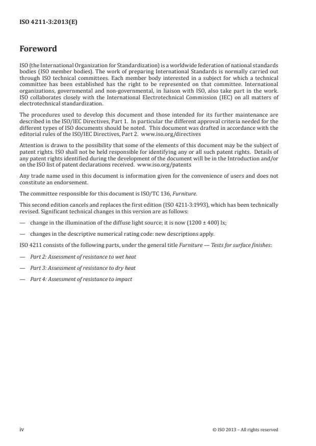 ISO 4211-3:2013 specifies a method for the assessment of the resistance to dry heat of all rigid furniture surfaces regardless of materials. It does not apply to leather and textile surfaces.