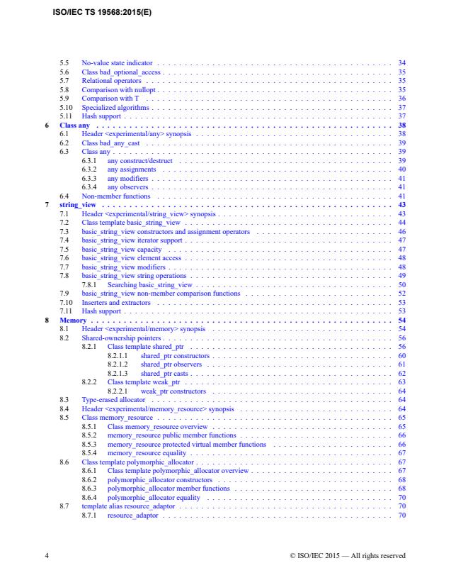 ISO/IEC TS 19568:2015 describes extensions to the C++ Standard Library (1.2). These extensions are classes and functions that are likely to be used widely within a program and/or on the interface boundaries between libraries written by different organizations. ISO/IEC TS 19568:2015 is non-normative. Some of the library components in this technical specification may be considered for standardization in a future version of C++, but they are not currently part of any C++ standard. Some of the components in this technical specification may never be standardized, and others may be standardized in a substantially changed form. The goal of ISO/IEC TS 19568:2015 is to build more widespread existing practice for an expanded C++ standard library. It gives advice on extensions to those vendors who wish to provide them.
