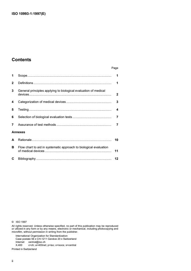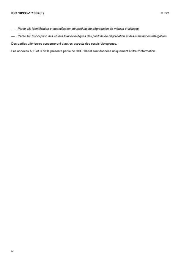 ISO 10993-1:1997 is a standard published by the International Organization for Standardization (ISO). Its full title is "Biological evaluation of medical devices — Part 1: Evaluation and testing". This standard covers: La présente partie de l'ISO 10993 décrit a) les principes généraux sur lesquels repose l'évaluation biologique des dispositifs médicaux; b) la classification de dispositifs, basée sur la nature et la durée de leur contact avec le corps humain; c) le choix des essais appropriés. La présente partie de l'ISO 10993 ne traite pas de l'essai des matériaux et dispositifs qui n'entrent pas directement ou indirectement en contact avec le corps du patient. Elle n'aborde pas non plus les risques biologiques dus aux défaillances mécaniques. Les autres parties de l'ISO 10993 concernent des essais spécifiques comme indiqués dans l'avant-propos (voir également les justificatifs en A.2).