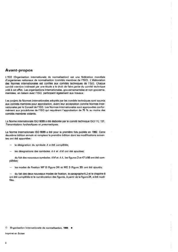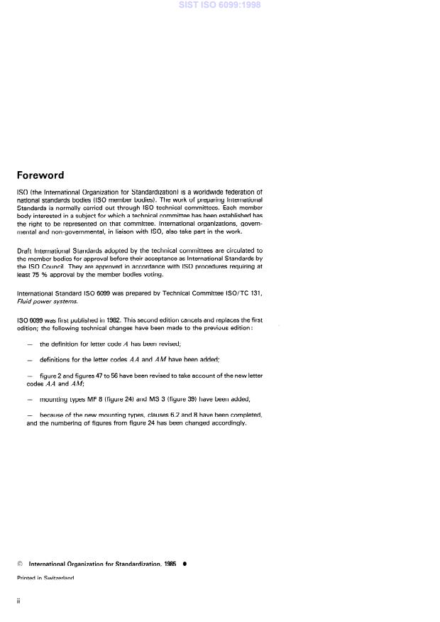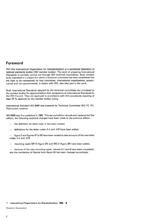 ISO 6099:1985 is a standard published by the International Organization for Standardization (ISO). Its full title is "Fluid power systems and components — Cylinders — Identification code for mounting dimensions and mounting types". This standard covers: Specifies a conventional system for identifying cylinder dimensions and mounting dimensions thereof. Such a system will be composed of: a letter code for identifying mounting dimensions, envelope dimensions, cylinder fitting dimensions; a code for identifying cylinder mounting types. Although presents a code and a method of dimensioning (illustrated by 56 figures), it is not intended that all dimensions shall be standardized. Includes a listing for letter codes. This second edition cancels and replaces the first edition (1982).