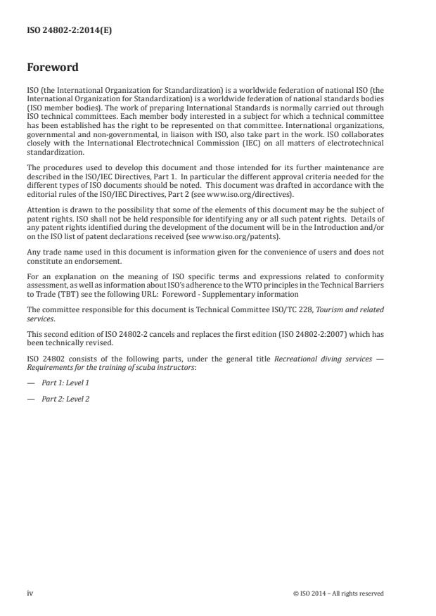 ISO 24802-2:2014 is a standard published by the International Organization for Standardization (ISO). Its full title is "Recreational diving services — Requirements for the training of scuba instructors — Part 2: Level 2". This standard covers: ISO 24802-2:2014 specifies the competencies required of a scuba instructor in order to obtain a scuba instructor qualification from a training organization attesting that he/she has met or exceeded scuba instructor level 2, and specifies evaluation criteria for these competencies. It also specifies the conditions under which training is provided, in addition to the general requirements for recreational diving service provision in accordance with ISO 24803. ISO 24802-2:2014 applies to training and evaluation in recreational scuba diving.