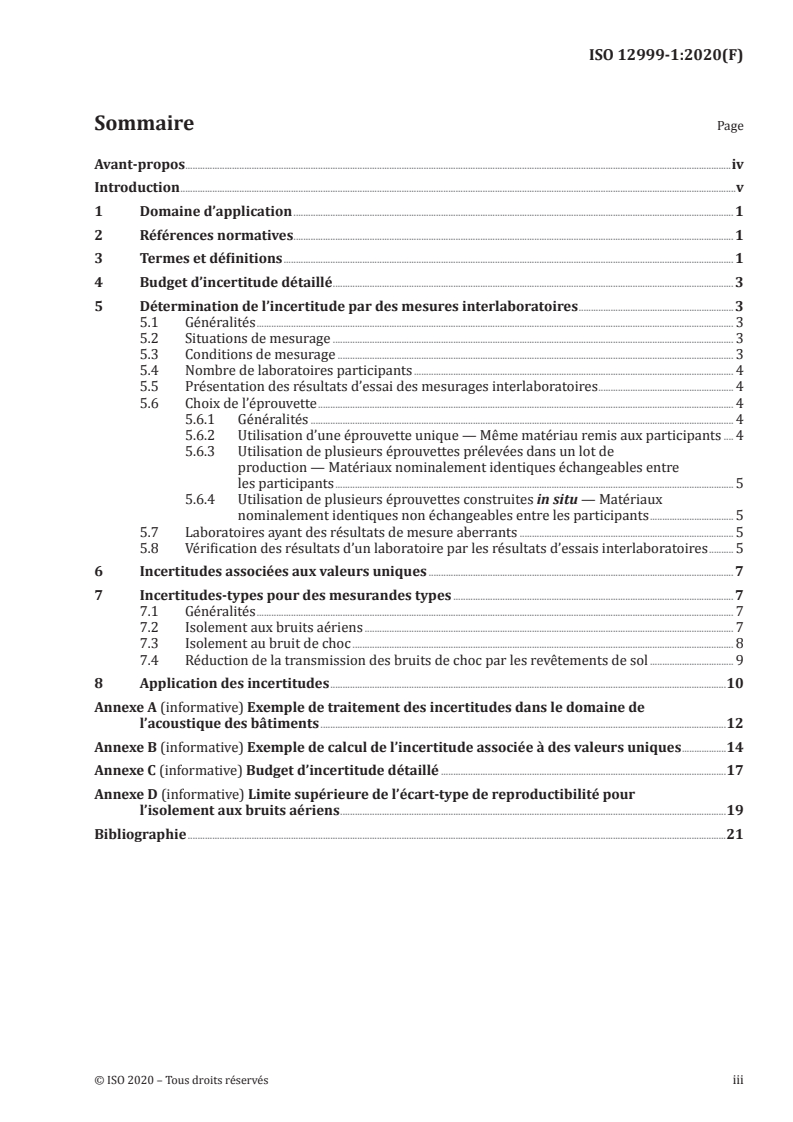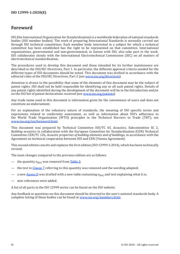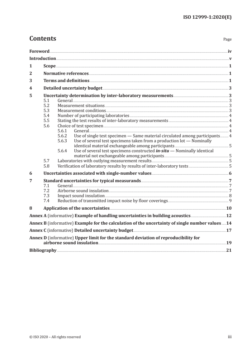 ISO 12999-1:2020 is a standard published by the International Organization for Standardization (ISO). Its full title is "Acoustics — Determination and application of measurement uncertainties in building acoustics — Part 1: Sound insulation". This standard covers: This document specifies procedures for assessing the measurement uncertainty of sound insulation in building acoustics. It provides for — a detailed uncertainty assessment; — a determination of uncertainties by inter-laboratory tests; — an application of uncertainties. Furthermore, typical uncertainties are given for quantities determined according to ISO 10140 (all parts), ISO 16283 (all parts) and ISO 717 (all parts).