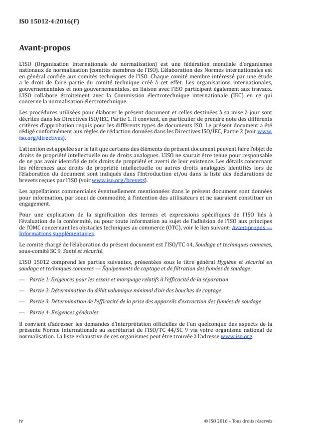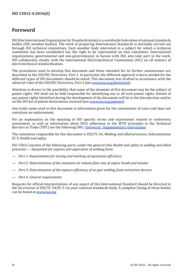 ISO 15012-4:2016 is a standard published by the International Organization for Standardization (ISO). Its full title is "Health and safety in welding and allied processes — Equipment for capture and separation of welding fume — Part 4: General requirements". This standard covers: ISO 15012-4:2016 defines the general requirements for ventilation equipment used to control exposure to fumes generated by welding and allied processes. It applies to the design and manufacture of all parts of the equipment including hoods, ducting, filter units, air movers, systems that inform of unsafe operation and workplace practices to ensure safe working with regard to exposure. Significant hazards are listed in Clause 4. It does not cover electrical, mechanical and pneumatic hazards. ISO 15012-4:2016 is applicable to the following: - local exhaust ventilation systems (LEV); - mobile and stationary equipment. It is not applicable to the following: - general ventilation, air make up or air movement systems; - air conditioning systems; - separation of gases generated by or used by welding and allied processes; - LEV used for welding and allied processes that generate reactive potentially explosive particles and atmospheres; - grinding dust. ISO 15012-4:2016 applies to systems designed and manufactured after its publication.