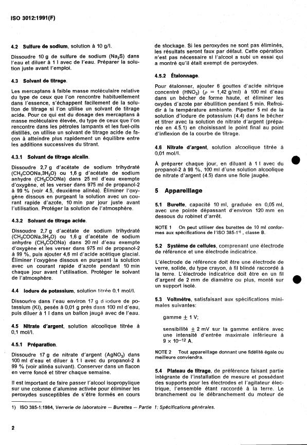 ISO 3012:1991 - Essence, pétroles lampants et fuel-oils distillés -- Dosage du soufre sous forme de mercaptans -- Méthode potentiométrique