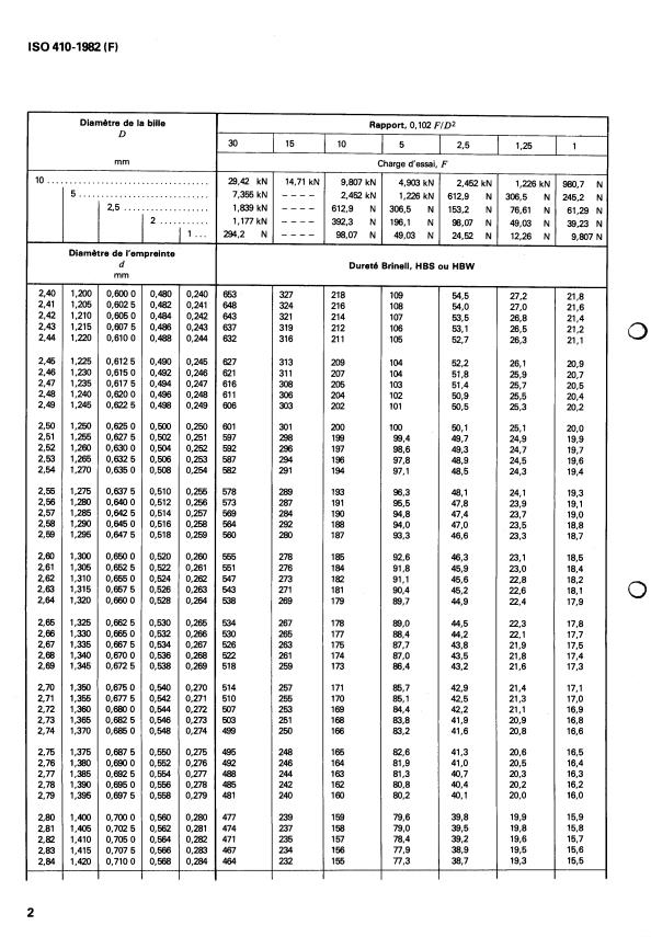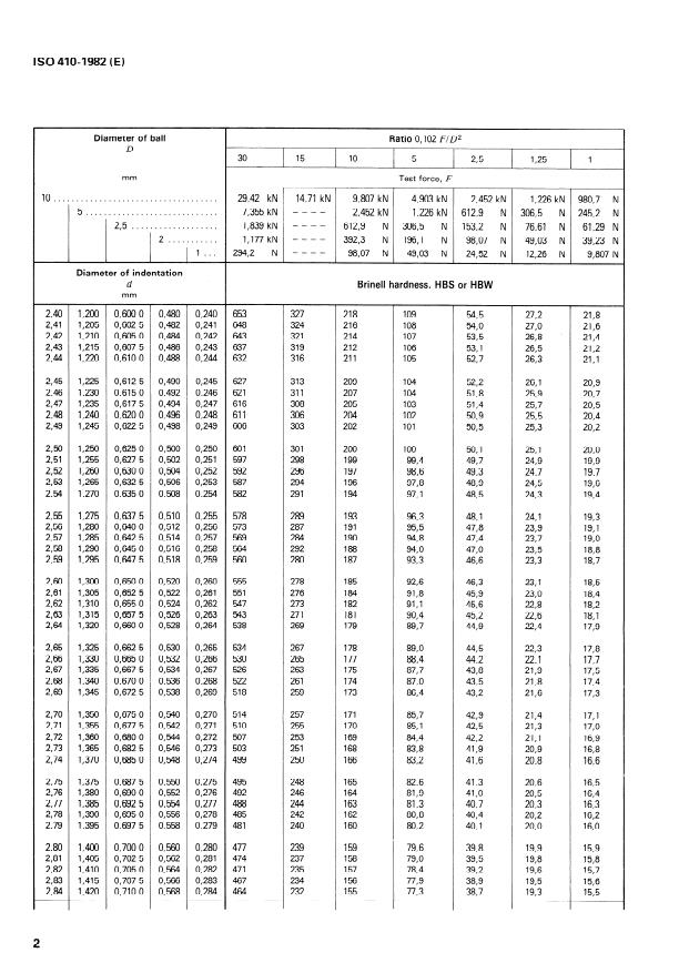 ISO 410:1982 is a standard published by the International Organization for Standardization (ISO). Its full title is "Metallic materials — Hardness test — Tables of Brinell hardness values for use in tests made on flat surfaces". This standard covers: Metallic materials — Hardness test — Tables of Brinell hardness values for use in tests made on flat surfaces