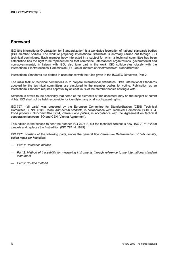 ISO 7971-2:2009 is a standard published by the International Organization for Standardization (ISO). Its full title is "Cereals — Determination of bulk density, called mass per hectolitre — Part 2: Method of traceability for measuring instruments through reference to the international standard instrument". This standard covers: ISO 7971-2:2009 specifies a test method for ensuring the traceability of mass per hectolitre measuring instruments through reference to standard measurement instruments. The mass per hectolitre or bulk density is of commercial importance for grain cereals. Several types of instruments with varying performances exist for measuring it. ISO 7971-2:2009 also specifies the performances required of national standards instruments, secondary standards instruments, and measuring instruments used in laboratories or in collection or storage silos.
