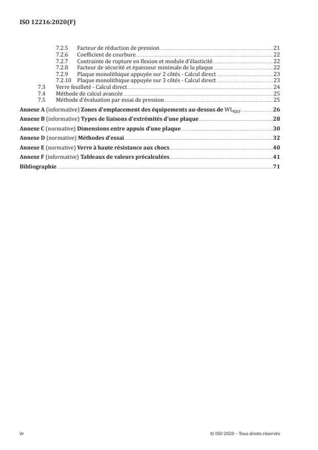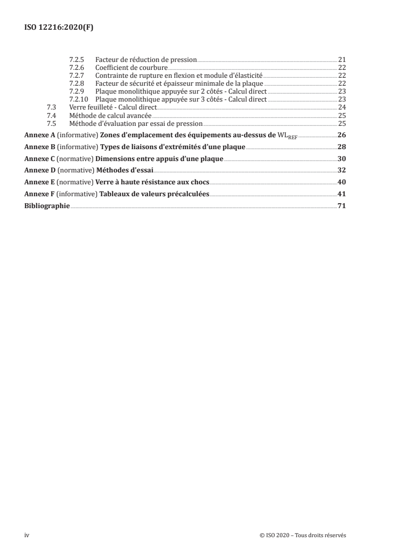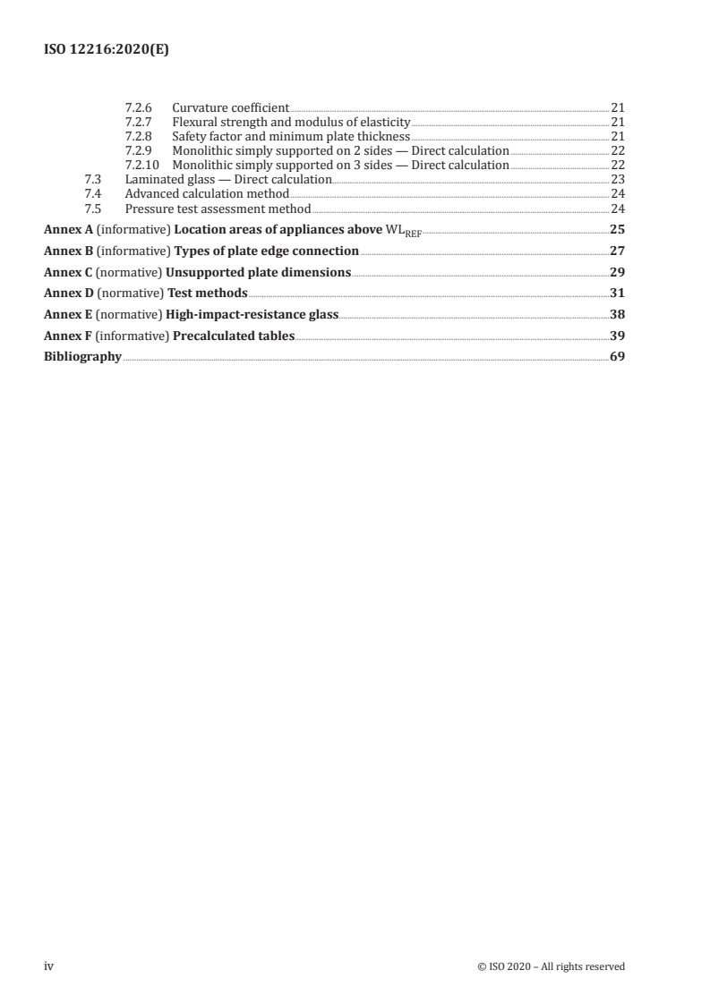 - Strength assessment methods: Multiple assessment routes including direct calculation methods for monolithic and laminated plates, an advanced calculation method for certain non‑glazed plates, and pressure/test assessment methods (Clause 7).