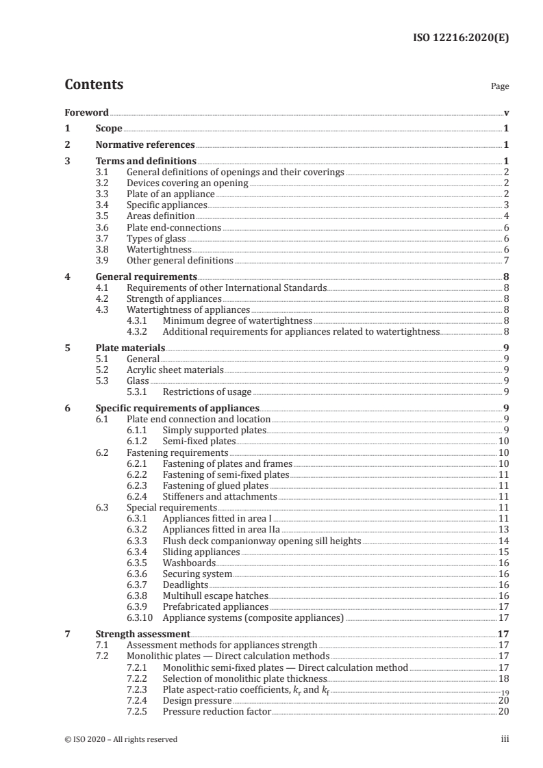 - Area‑specific rules: Special provisions for appliances in Area I and Area IIa, flush-deck hatches, sliding appliances, washboards, deadlights, multihull escape hatches and prefabricated appliances (Clause 6.3).