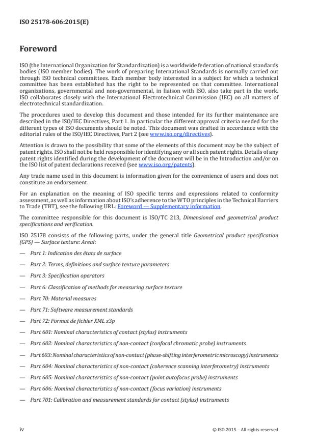 ISO 25178-606:2015 is a standard published by the International Organization for Standardization (ISO). Its full title is "Geometrical product specification (GPS) - Surface texture: Areal - Part 606: Nominal characteristics of non-contact (focus variation) instruments". This standard covers: ISO 25178-606:2015 defines the metrological characteristics of a particular non-contact method measuring surface texture using a focus variation (FV) sensor.