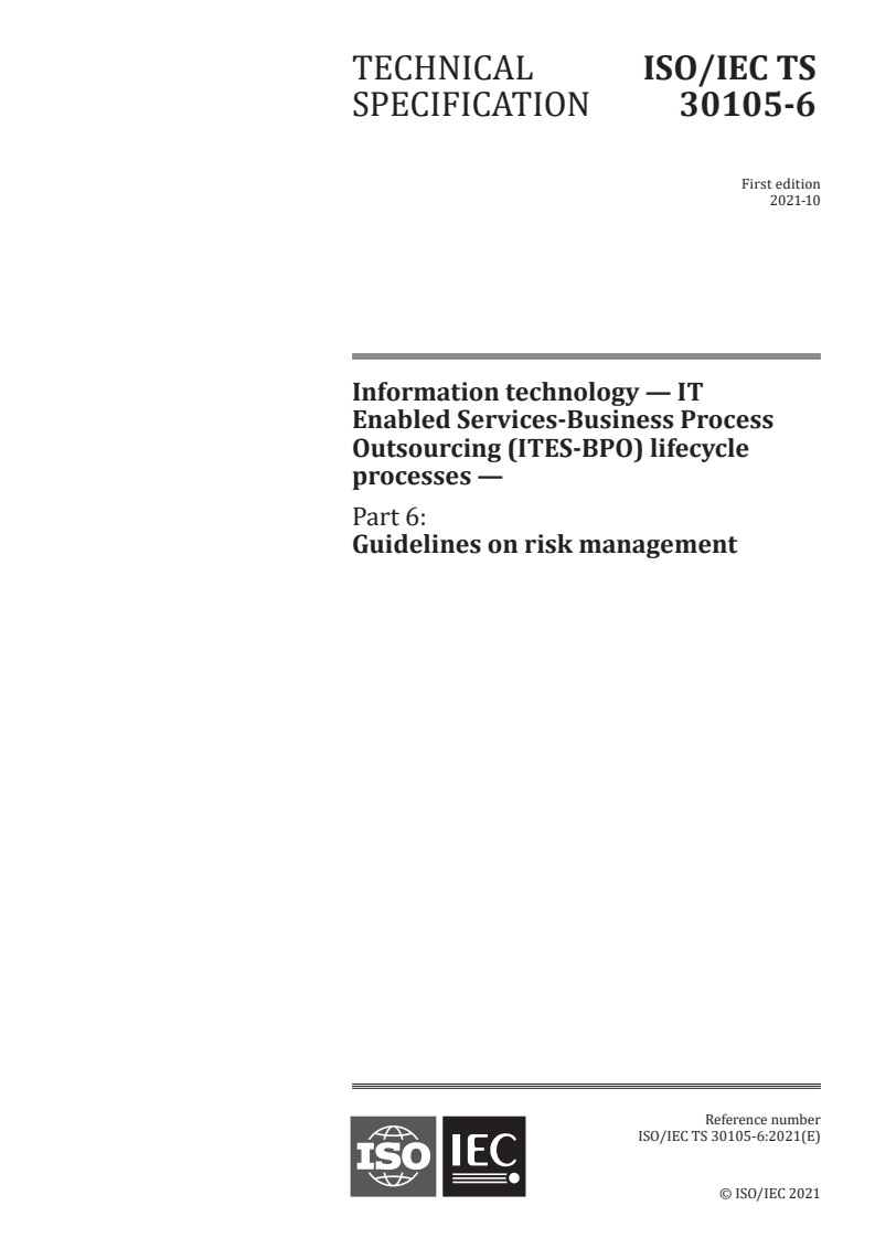 ISO/IEC TS 30105-6:2021 - Information technology — IT Enabled Services-Business Process Outsourcing (ITES-BPO) lifecycle processes — Part 6: Guidelines on risk management Released:20. 10. 2021