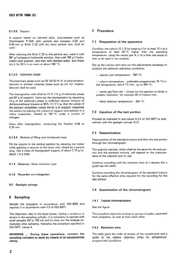 ISO 8175:1986 is a standard published by the International Organization for Standardization (ISO). Its full title is "Propylene for industrial use — Determination of oligomers — Gas chromatographic method". This standard covers: A liquid sample obtained at low temperature is vaporized and then passed through a chromatographic column which permits the separation of the oligomers. The detection is performed by flame ionization an the peaks obtained are compared with those derived from an external standard. The method is applicable to propylene having propene dimers (hexenes) contents greater than 20mg/kg and propene trimers (nonenes) contents greater than 30 mg/kg.