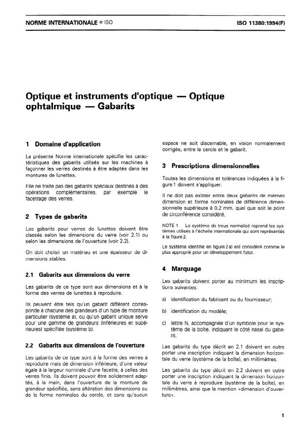 ISO 11380:1994 - Optique et instruments d'optique -- Optique ophtalmique -- Gabarits