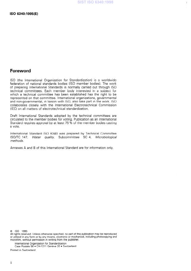 ISO 6340:1995 is a standard published by the International Organization for Standardization (ISO). Its full title is "Water quality - Detection and enumeration of Salmonella". This standard covers: Specifies a method for the detection of Salmonella in water samples for monitoring purposes. Applicable to all kinds of water, except raw sewage.