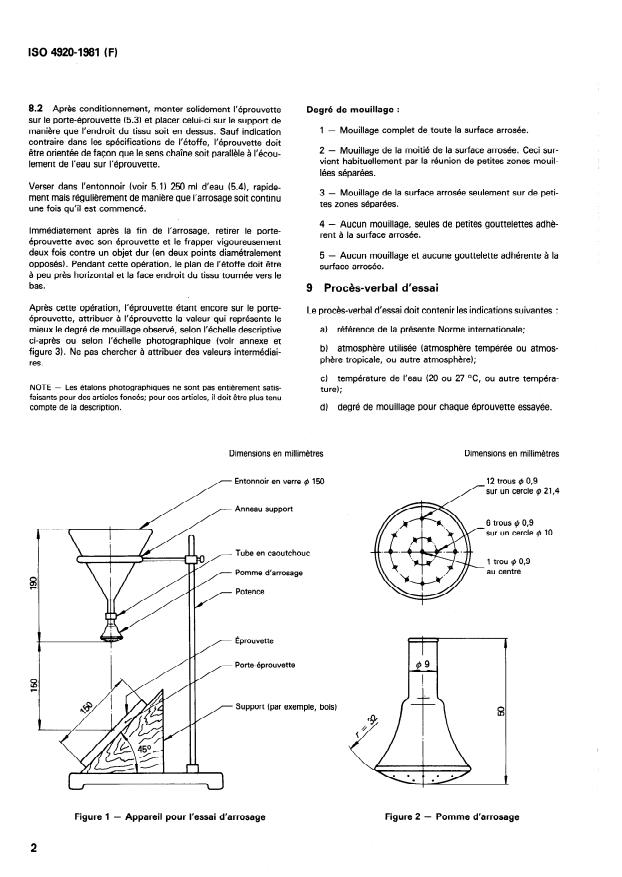 ISO 4920:1981 - Étoffes -- Détermination de la résistance au mouillage superficiel (Essai d'arrosage)