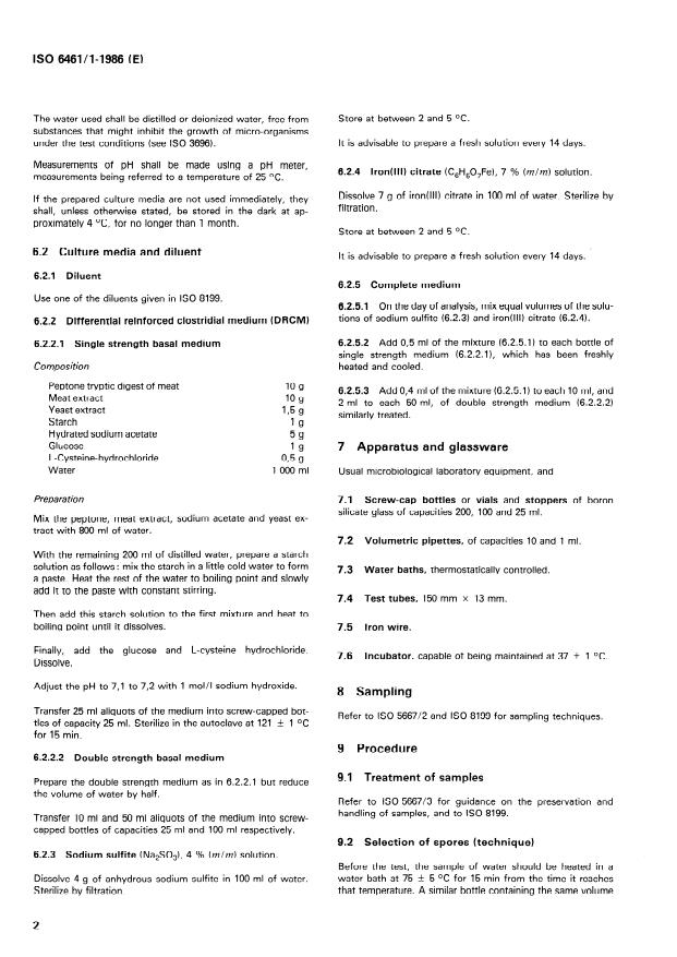 ISO 6461-1:1986 is a standard published by the International Organization for Standardization (ISO). Its full title is "Water quality - Detection and enumeration of the spores of sulfite-reducing anaerobes (clostridia) - Part 1: Method by enrichment in a liquid medium". This standard covers: The procedure is applicable to all types of water, including turbid water. The principle covers several steps from selection by applying heat to destroy vegetative bacteria to the indication by inoculating volumes of the sample into media followed by incubation at 27 ± °C in anaerobic conditions.