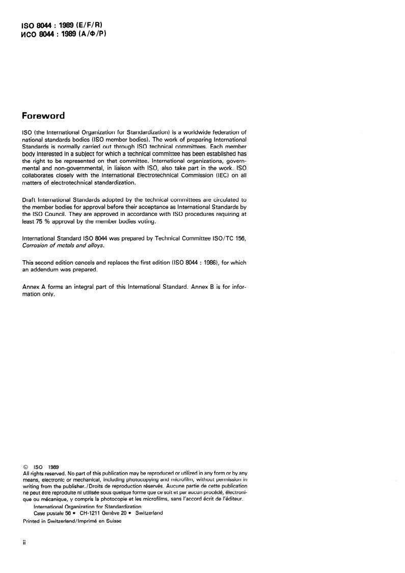 ISO 8044:1989 is a standard published by the International Organization for Standardization (ISO). Its full title is "Corrosion of metals and alloys — Vocabulary". This standard covers: Corrosion of metals and alloys — Vocabulary