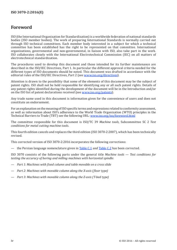 ISO 3070-2:2016 specifies, with reference to ISO 230‑1, ISO 230‑7 and ISO 230‑2, geometric tests, spindle tests and tests for checking the accuracy and repeatability of positioning by numerical control of horizontal spindle boring and milling machines having a movable column along the X-axis and also specifies the applicable tolerances corresponding to general-purpose, normal accuracy machines. This type of machines are usually provided with sliding boring spindles and can be provided with universal spindle heads of the following types, whose test conditions are covered by ISO 17543‑1: - fixed or indexable heads, with accessory spindle(s) square to the Z-axis, with or without one spindle parallel to the Z-axis; - 45° split indexable heads, with mechanical indexing of the different angular positions of the two bodies (e.g. Hirth couplings); - 45° split continuous heads, provided with continuous positioning of the two numerically controlled axes; - swivel heads, with two numerically controlled rotary axes perpendicular to each other. Test conditions for accessory facing heads are specified in Annex B. ISO 3070-2:2016 concerns machines having movement of the column on the bed (X-axis), vertical movement of the spindle head on the column (Y-axis), axial movement of the ram (Z-axis), axial movement of the boring spindle (W-axis), and, in most cases, one or more tables moving on a bed parallel to the spindle (R-axis) and rotating around a vertical axis (B-axis). ISO 3070-2:2016 deals only with the verification of the accuracy of the machine. It does not apply to the operational testing of the machine (e.g. vibration, abnormal noise, stick-slip motion of components) nor to machine characteristics (e.g. speeds, feeds), as such checks are generally carried out before testing the accuracy.