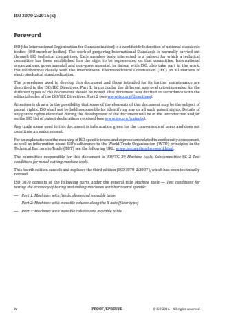ISO 3070-2:2016 is a standard published by the International Organization for Standardization (ISO). Its full title is "Machine tools - Test conditions for testing the accuracy of boring and milling machines with horizontal spindle - Part 2: Machines with movable column along the X-axis (floor type)". This standard covers: ISO 3070-2:2016 specifies, with reference to ISO 230‑1, ISO 230‑7 and ISO 230‑2, geometric tests, spindle tests and tests for checking the accuracy and repeatability of positioning by numerical control of horizontal spindle boring and milling machines having a movable column along the X-axis and also specifies the applicable tolerances corresponding to general-purpose, normal accuracy machines. This type of machines are usually provided with sliding boring spindles and can be provided with universal spindle heads of the following types, whose test conditions are covered by ISO 17543‑1: - fixed or indexable heads, with accessory spindle(s) square to the Z-axis, with or without one spindle parallel to the Z-axis; - 45° split indexable heads, with mechanical indexing of the different angular positions of the two bodies (e.g. Hirth couplings); - 45° split continuous heads, provided with continuous positioning of the two numerically controlled axes; - swivel heads, with two numerically controlled rotary axes perpendicular to each other. Test conditions for accessory facing heads are specified in Annex B. ISO 3070-2:2016 concerns machines having movement of the column on the bed (X-axis), vertical movement of the spindle head on the column (Y-axis), axial movement of the ram (Z-axis), axial movement of the boring spindle (W-axis), and, in most cases, one or more tables moving on a bed parallel to the spindle (R-axis) and rotating around a vertical axis (B-axis). ISO 3070-2:2016 deals only with the verification of the accuracy of the machine. It does not apply to the operational testing of the machine (e.g. vibration, abnormal noise, stick-slip motion of components) nor to machine characteristics (e.g. speeds, feeds), as such checks are generally carried out before testing the accuracy.