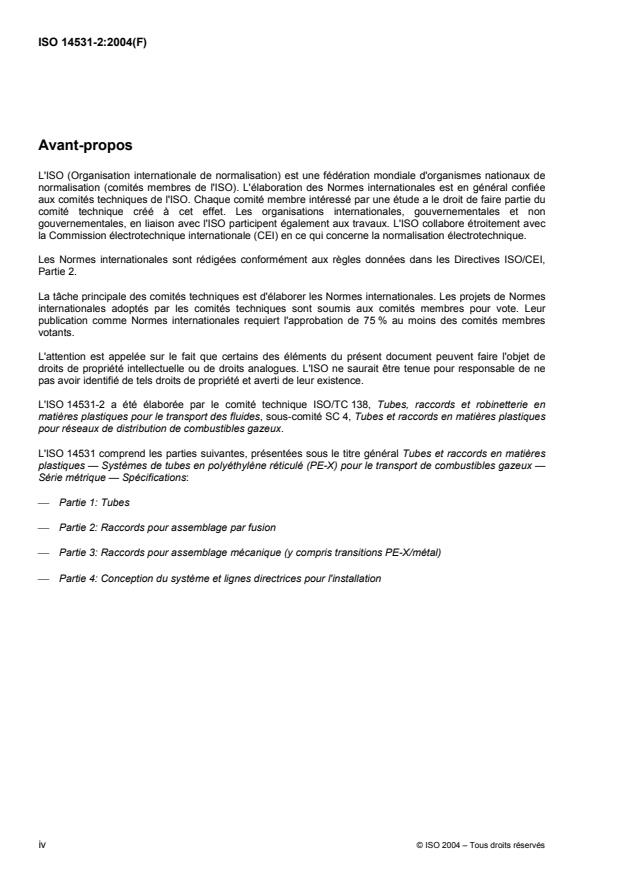 ISO 14531-2:2004 is a standard published by the International Organization for Standardization (ISO). Its full title is "Plastics pipes and fittings - Crosslinked polyethylene (PE-X) pipe systems for the conveyance of gaseous fuels - Metric series - Specifications - Part 2: Fittings for heat-fusion jointing". This standard covers: ISO 14531-2:2004 specifies the physical properties and mechanical performance requirements of crosslinked polyethylene (PE-X) and polyethylene (PE) socket, saddle and spigot fittings for the connection by socket or saddle heat-fusion jointing techniques of PE-X pipes manufactured in accordance with ISO 14531-1. In addition, it lays down dimensional requirements and specifies some general material properties (including chemical resistance) together with a classification scheme for PE-X fitting base materials produced in the form of pipe. When used in conjunction with the other parts of ISO 14531, it provides the basis for the design, manufacture and installation of PE-X piping systems (PE-X pipes, PE-X fusion fittings and mechanical fittings) for the supply of category D and category E gaseous fuels.
