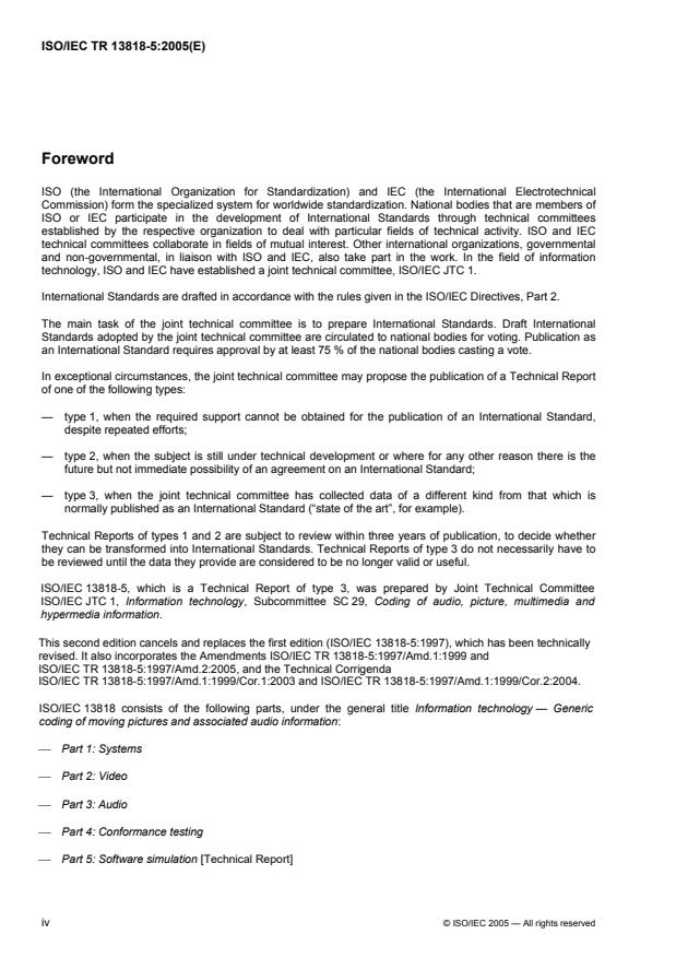 ISO/IEC TR 13818-5:2005 is a technical report published by the International Organization for Standardization (ISO). Its full title is "Information technology - Generic coding of moving pictures and associated audio information - Part 5: Software simulation". This standard covers: ISO/IEC 13818-5:2005-05-23 provides a C language software simulation of an encoder and decoder for Part 1 (Systems), Part 2 (Video), Part 3 (Audio), Part 7 (AAC) and Part 11 (IPMP) of ISO/IEC 13818.