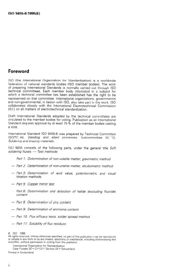 ISO 9455-6:1995 is a standard published by the International Organization for Standardization (ISO). Its full title is "Soft soldering fluxes — Test methods — Part 6: Determination and detection of halide (excluding fluoride) content". This standard covers: Describes three quantitative titration methods for the determination of halogenides (excluding fluoride) in soft soldering water-soluble fluxes.