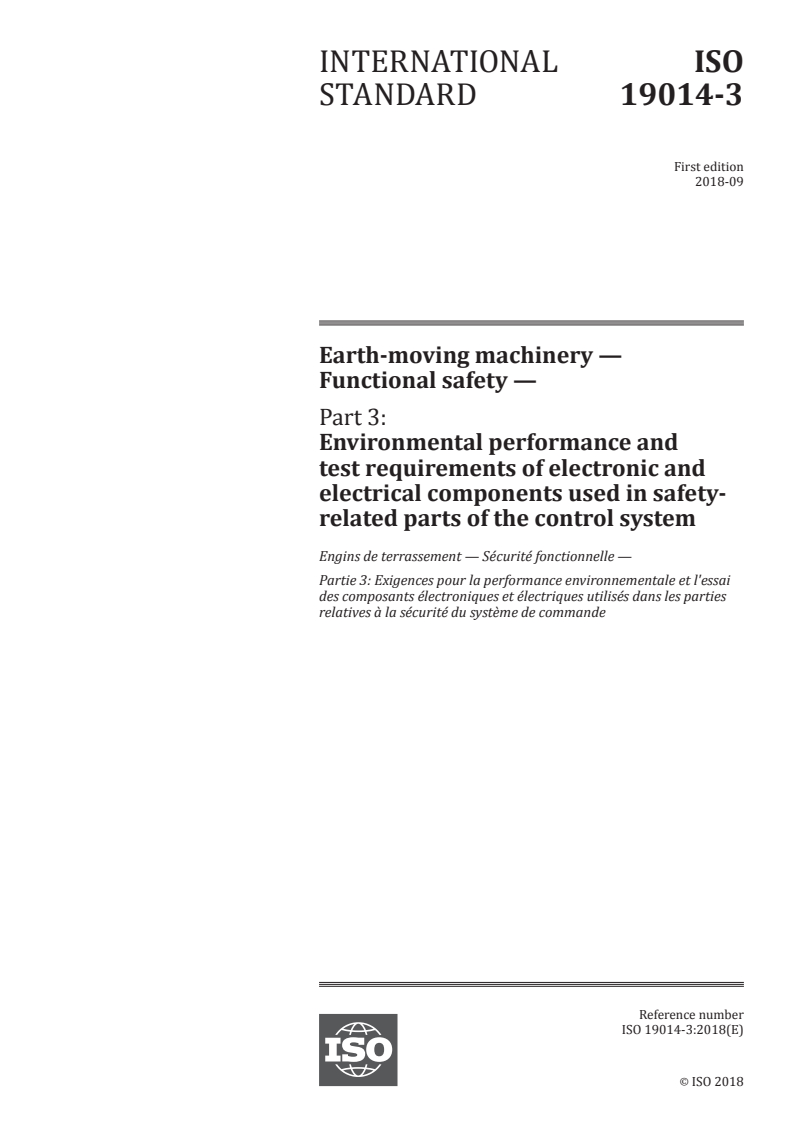 ISO 19014-3:2018 is a standard published by the International Organization for Standardization (ISO). Its full title is "Earth-moving machinery — Functional safety — Part 3: Environmental performance and test requirements of electronic and electrical components used in safety-related parts of the control system". This standard covers: This document specifies the minimum requirements for environmental testing of electronic and electrical components identified as safety-related parts of the control system (SRP/CS) used on earth-moving machinery (EMM) as defined in ISO 6165 and their attachments.