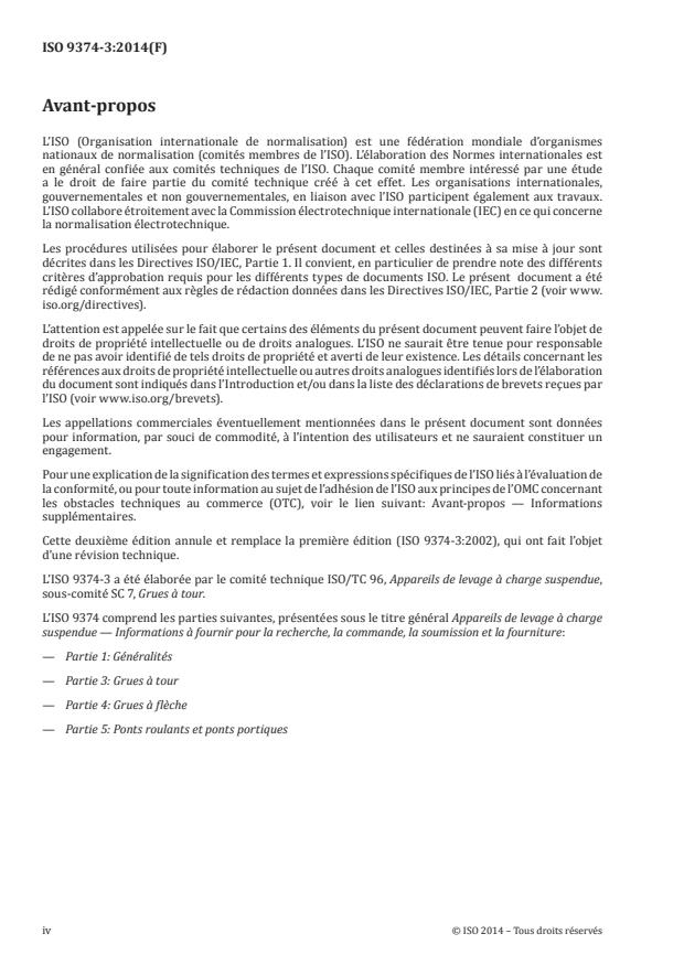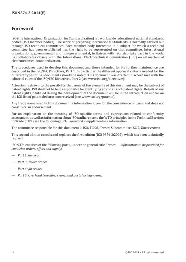 ISO 9374-3:2014 is a standard published by the International Organization for Standardization (ISO). Its full title is "Cranes — Information to be provided for enquiries, orders, offers and supply — Part 3: Tower cranes". This standard covers: ISO 9374-3:2014 gives guidance for information to be provided: a) by the purchaser when enquiring for a tower crane, b) by the purchaser when ordering a tower crane, c) by a manufacturer when offering (tendering) for a tower crane, d) by the manufacturer when supplying a tower crane.