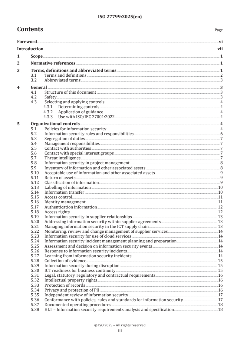 This document provides information security controls, including implementation guidance, for health organizations. It is based on ISO/IEC 27002:2022 In addition to generic ICT equipment and software used in many other environments, the scope of this document includes software and systems specifically for healthcare, such as electronic health record systems and medical devices incorporating health software. Such medical devices can be programmed or programmable and can contain software, firmware or both. Other digital equipment (such as that for environmental and infection control, building management, and physical security), which can be used in premises where healthcare is provided, is also in scope. This document applies to information in all its aspects, whatever form the information takes (including text and numbers, sound recordings, drawings, images and video), by whatever means it has been acquired or captured, whatever means are used to store it (such as printing or writing on paper or storage electronically), and whatever means are used to transfer or exchange it (orally, by hand, by post, movement of storage media, direct links or networking). This document is for organizations of all types and sizes that provide healthcare or are custodians of personal health information for other reasons. The information that they are responsible for can be stored and processed in many possible ways and locations, including on premises or in the cloud, but remains in scope. This document applies to all physical settings where healthcare is intended to be delivered, such as hospitals, clinics and other locations or facilities designated for healthcare purposes such as ambulances and mobile imaging or diagnostic units. It also applies to care provided elsewhere, such as in residential premises. In addition to the range of settings, this document applies to all methods of service provision including remote or virtual healthcare.