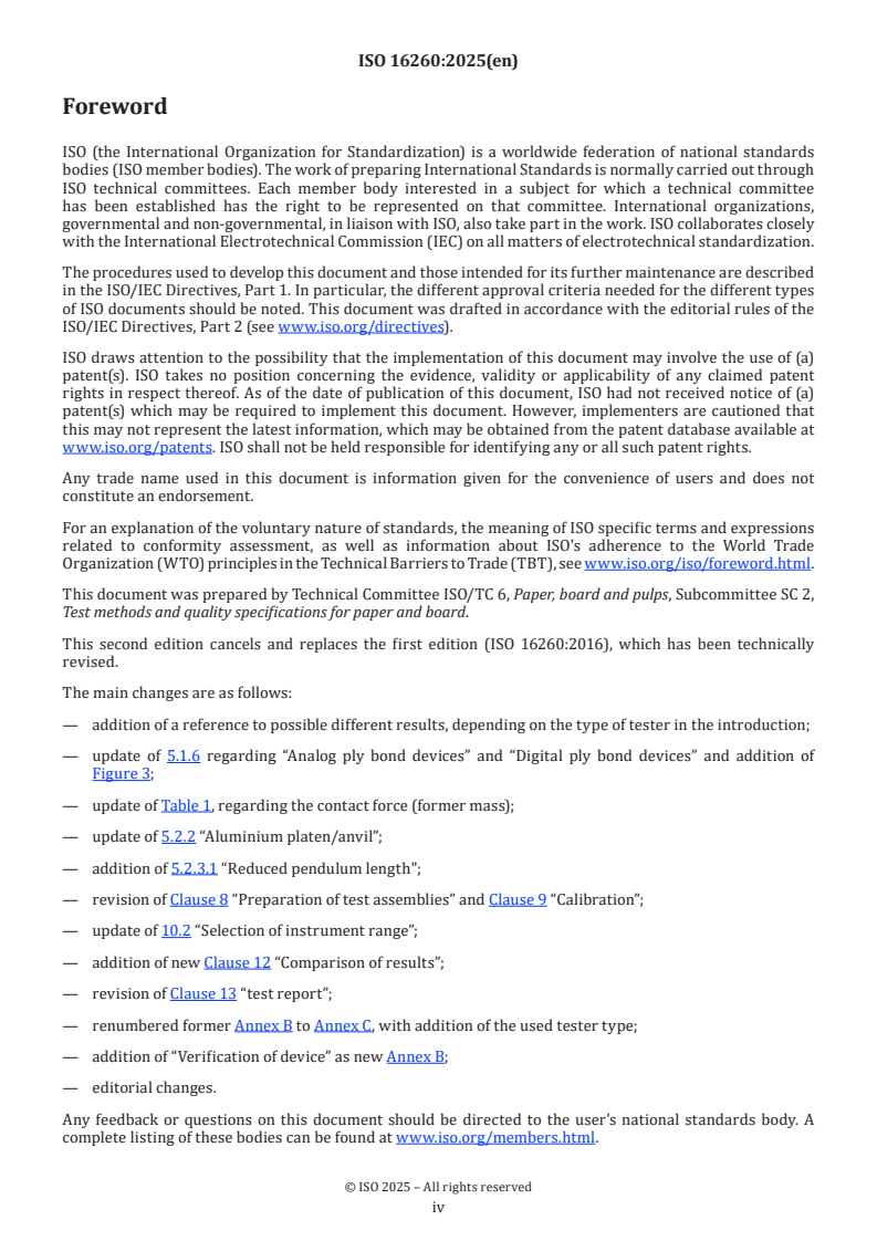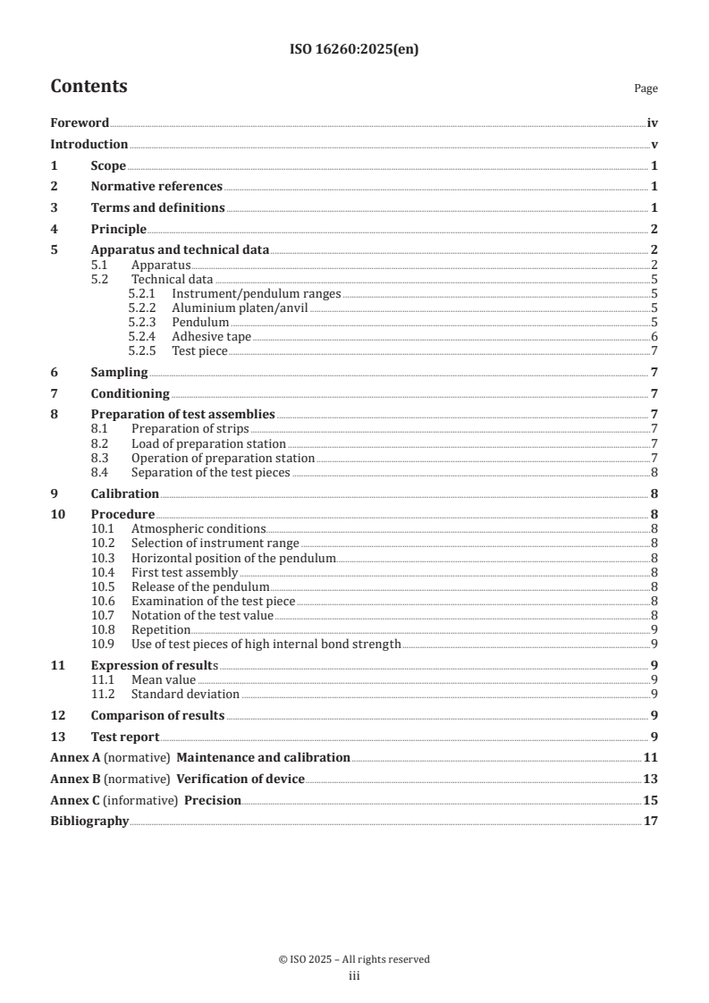 ISO 16260:2025 is a standard published by the International Organization for Standardization (ISO). Its full title is "Paper and board - Determination of internal bond strength". This standard covers: This document specifies a method to measure the energy required to rapidly delaminate a test piece of paper or board. Rupture of the test piece in the “Z” or thickness direction is initiated by a pendulum having a defined mass, moving at a defined velocity. The procedure is suitable for both single- and multi-ply papers and boards, including coated sheets and those that are laminated with synthetic polymer films. It is particularly suitable for papers and boards that can be subjected to z-direction rapid impacts, impulses or shock loads during printing or conversion. The test procedure entails the adherence of double-sided adhesive tape to both sides of the test piece under pressure. For this reason, the method is unsuitable for materials that can be structurally damaged by compression or are porous enough to permit migration of the tape adhesive into or through the test piece.