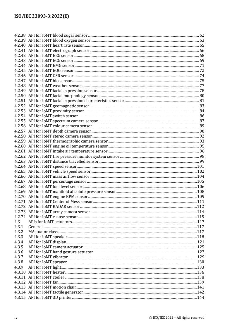 ISO/IEC 23093-3:2022 is a standard published by the International Organization for Standardization (ISO). Its full title is "Information technology - Internet of media things - Part 3: Media data formats and APIs". This standard covers: This document specifies the syntax and semantics of description schemes to represent data exchanged by media things (e.g., media sensors, media actuators, media analysers, media storages). Moreover, it specifies the APIs to exchange these data between media things. This document does not specify how sensing and analysing is carried out but defines the interfaces between the media things.