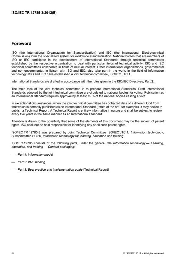 ISO/IEC TR 12785-3:2012 is a Technical Report from ISO/IEC JTC 1/SC 36 that provides best practice and implementation guidance for content packaging in the learning, education and training (LET) domain. It explains how common use cases are satisfied by the ISO/IEC 12785 family (derived from IMS Global Learning Consortium Content Packaging v1.2) and focuses on constructing manifest documents and interoperable content packages for Learning Management Systems (LMS), repositories and delivery platforms.