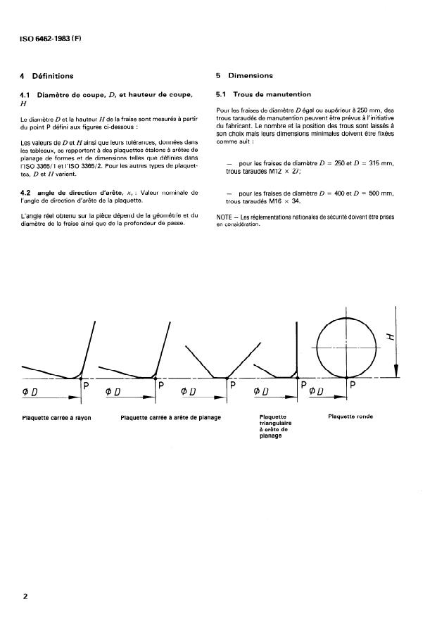 ISO 6462:1983 is a standard published by the International Organization for Standardization (ISO). Its full title is "Face milling cutters with indexable inserts — Dimensions". This standard covers: La présente Norme internationale fixe les dimensions des fraises à surfacer et à surfacer et dresser, à plaquettes amovibles. La forme et les dimensions des plaquettes sont laissées à l'initiative du fabricant. La gamme des diamètres extérieurs de ces fraises est extraite de l'ISO 523.