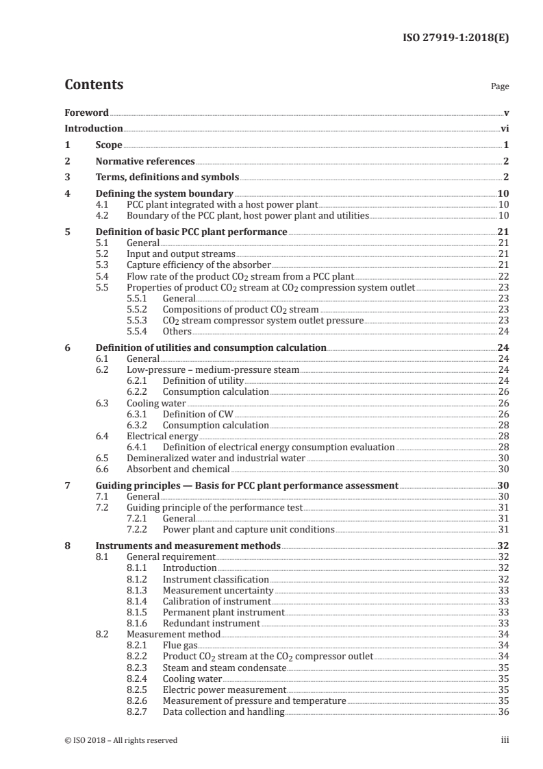 This document specifies methods for measuring, evaluating and reporting the performance of post-combustion CO2 capture (PCC) integrated with a power plant, and which separates CO2 from the power plant flue gas in preparation for subsequent transportation and geological storage. In particular, it provides a common methodology to calculate specific key performance indicators for the PCC plant, requiring the definition of the boundaries of a typical system and the measurements needed to determine the KPIs. This document covers thermal power plants burning carbonaceous fuels, such as coal, oil, natural gas and biomass-derived fuels, which are producing CO2 from boilers or gas turbines, and are integrated with CO2 capture. The PCC technologies covered by this document are those based on chemical absorption using reactive liquids, such as aqueous amine solutions, potassium carbonate solutions, and aqueous ammonia. Other PCC concepts based on different principles (e.g. adsorption, membranes, cryogenic) are not covered. The PCC plant can be installed for treatment of the full volume of flue gas from the power plant or a fraction of the total (i.e. a slip stream). Captured CO2 is processed in a compression or liquefaction step as determined by the conditions for transportation and storage. The KPIs considered in this document are the following: a) Specific thermal energy consumption (STEC); b) Specific electrical energy consumption (SEC); c) Specific equivalent electrical energy consumption (SEEC); d) Specific reduction in CO2 emissions (SRCE); e) Specific absorbent consumption (SAC) and specific chemical consumption (SCC). The calculations are based on measurements at the boundaries of the considered system, particularly of energy and utilities consumption. The integrated system includes the definition of interfaces between the PCC plant and the power plant. This document includes the following items: — The system boundary which defines the boundaries of the PCC plant and identifies which streams of energy and mass are crossing these boundaries to help power plant operators identify the key streams that are applicable for their particular case. — Basic PCC plant performance which defines the parameters that describe the basic performance of the PCC plant. — Definition of utilities and consumption calculation which lists the utility measurements required and provides guidance on how to convert utility measurements into the values required for the KPIs. — Guiding principles - Basis for PCC plant performance assessment which describes all guidelines to prepare, set-up and conduct the tests. — Instruments and measurement methods which lists the standards available for the relevant measurements and considerations to take into account when applying measurement methods to PCC plants. — Evaluation of key performance indicators which specifies the set of KPIs to be determined and their calculation methods to provide a common way of reporting them. This document does not provide guidelines for benchmarking, comparing or assessing KPIs of different technologies or different PCC projects. NOTE For the purposes of this document, thermal energy and electric energy are expressed by the unit of "J" (Joule) and "Wh" (Watt hour) respectively unless otherwise noted, with a prefix of International System of Units (SI) if necessary. (1 J = 1 W·s, 1 Wh = 1 W·h = 3 600 J).