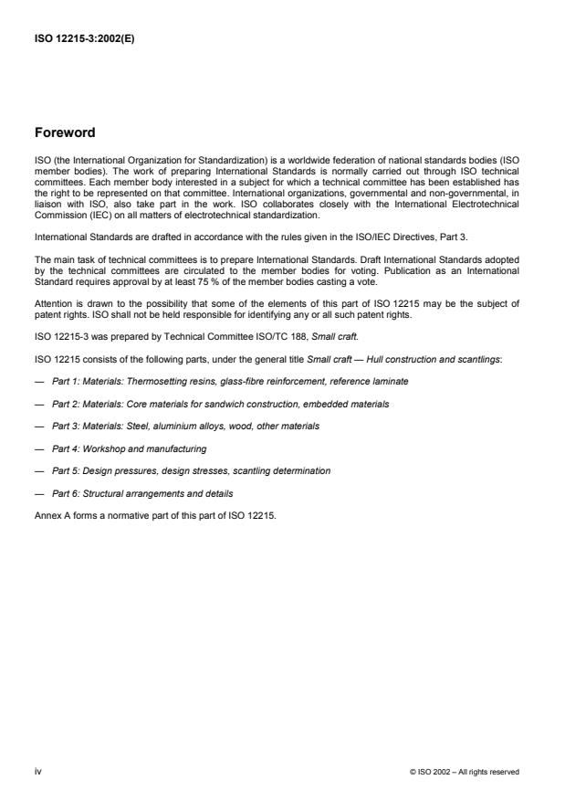 ISO 12215-3:2002 is a standard published by the International Organization for Standardization (ISO). Its full title is "Small craft - Hull construction and scantlings - Part 3: Materials: Steel, aluminium alloys, wood, other materials". This standard covers: This part of ISO 12215 specifies requirements for materials intended for use in the construction of the hull, superstructure and appendages, in particular: weldable normal and higher strength hot-rolled steel plates, wide flats, sections and bars; austenitic stainless steels, fabricated in the form of plates or profiles; wrought aluminium alloys fabricated as plates, sections and extruded profiles; wood in the form of solid timber, plywood or veneer; other suitable materials. This part of ISO 12215 applies to small craft with a hull length (LH) according to ISO 8666 of up to 24 m.
