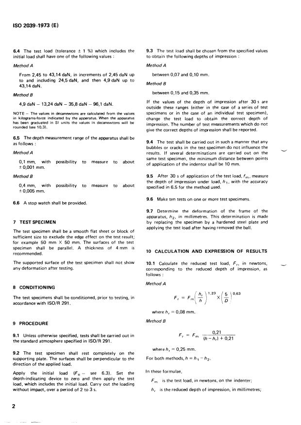 ISO 2039:1973 is a standard published by the International Organization for Standardization (ISO). Its full title is "Plastics and ebonite — Determination of hardness by the ball indentation method". This standard covers: Plastics and ebonite — Determination of hardness by the ball indentation method