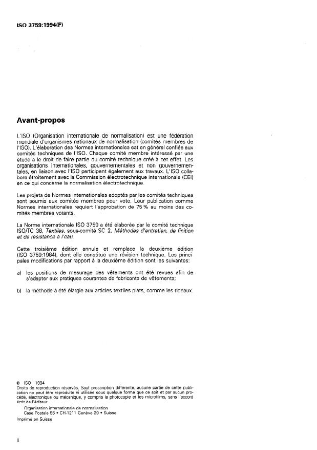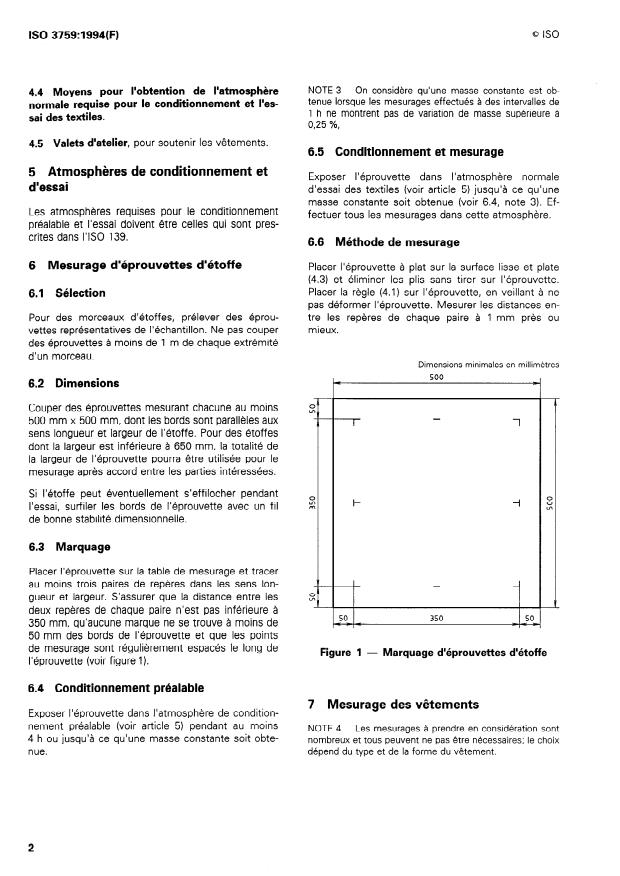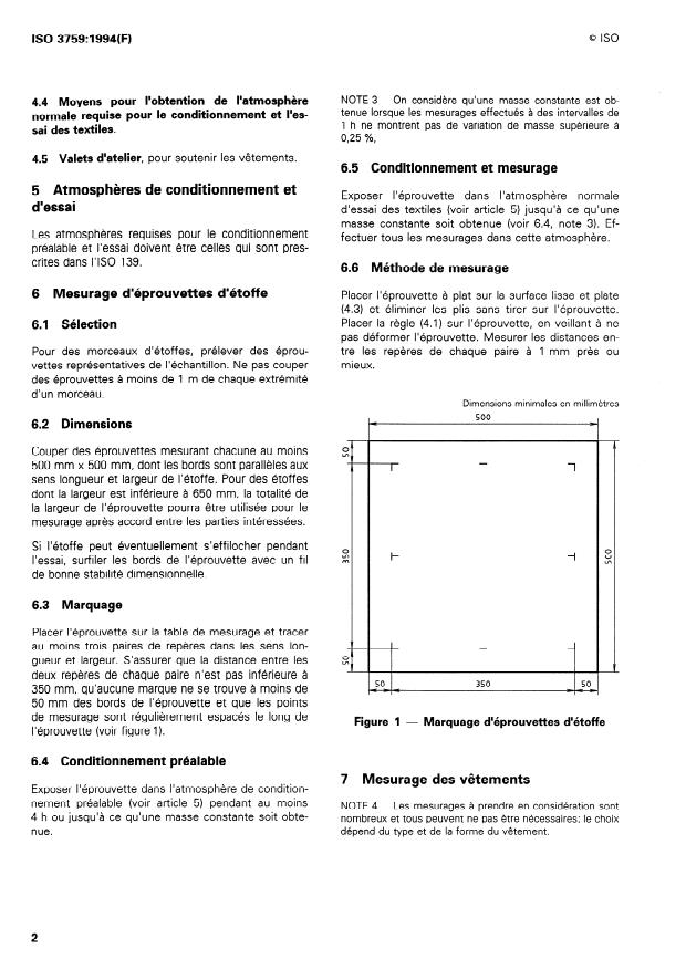 ISO 3759:1994 - Textiles -- Préparation, marquage et mesurage des éprouvettes d'étoffe et des vetements dans les essais de détermination de la variation des dimensions