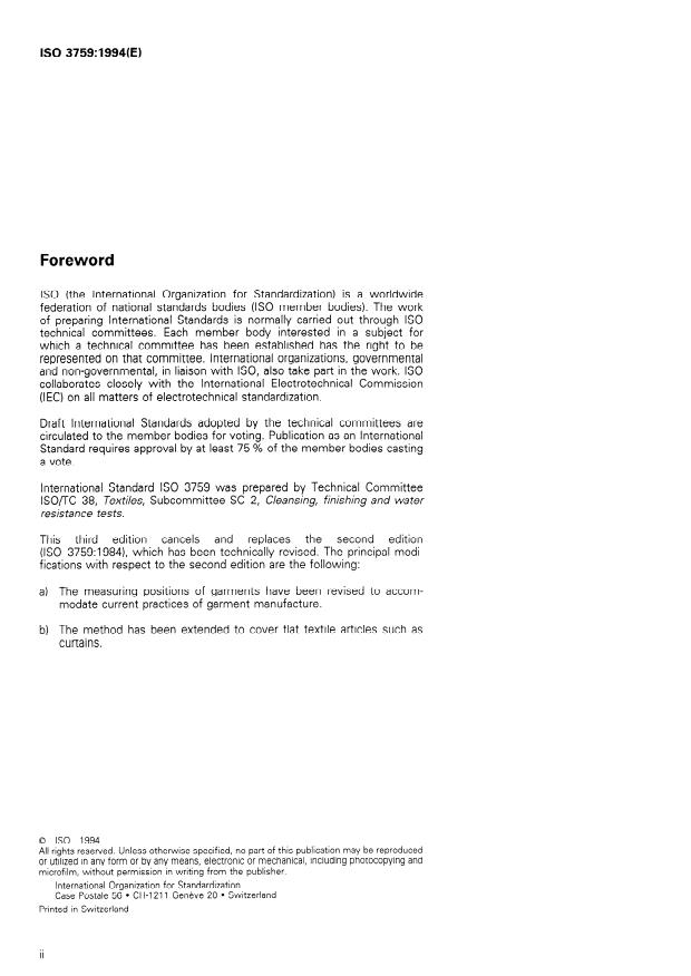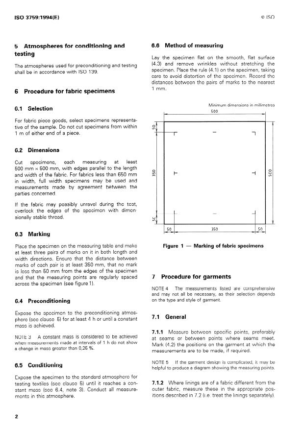 ISO 3759:1994 - Textiles -- Preparation, marking and measuring of fabric specimens and garments in tests for determination of dimensional change
