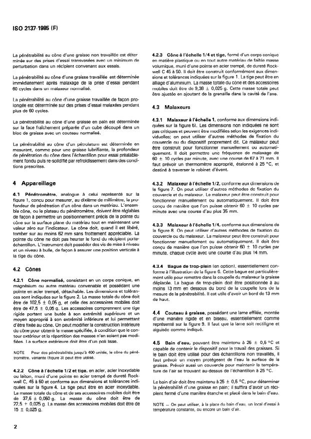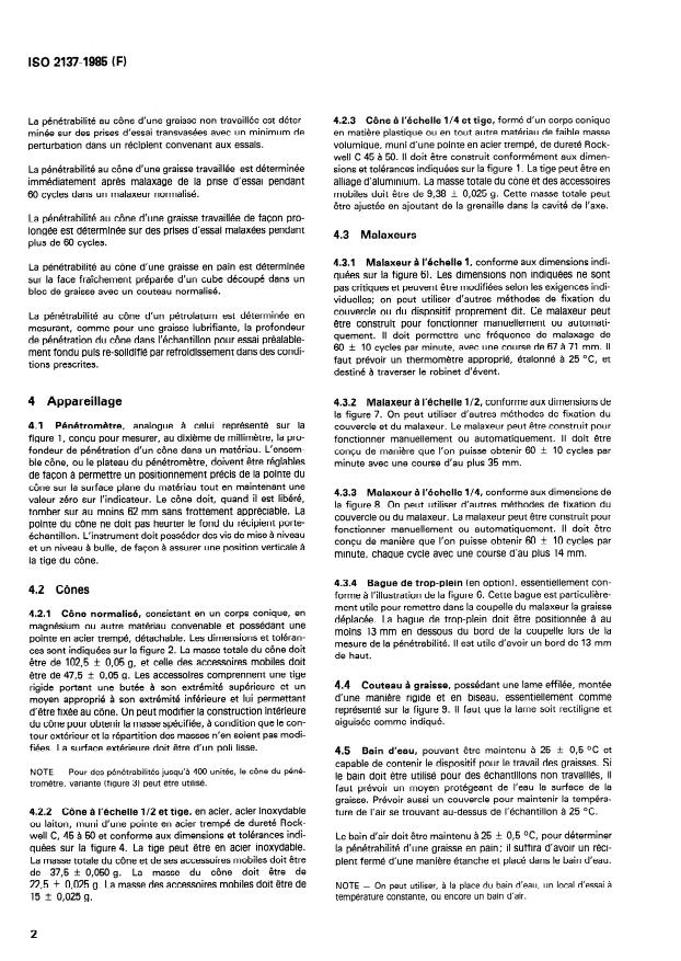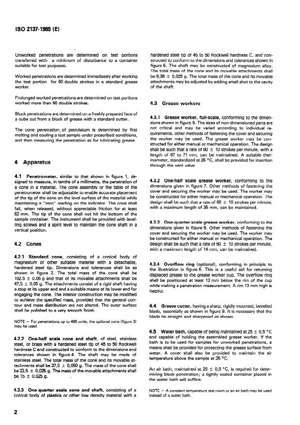 ISO 2137:1985 is a standard published by the International Organization for Standardization (ISO). Its full title is "Petroleum products — Lubricating grease and petrolatum — Determination of cone penetration". This standard covers: Section One gives four procedures for determination of the consistency by measurement of the penetration of a standard cone. Section Two gives methods, when only small samples are available, by the use of cones a half or quarter scale of that used in Section One. The methods are applicable to penetrations of 175 to 385 units. They are not intended to replace the full-scale penetration.