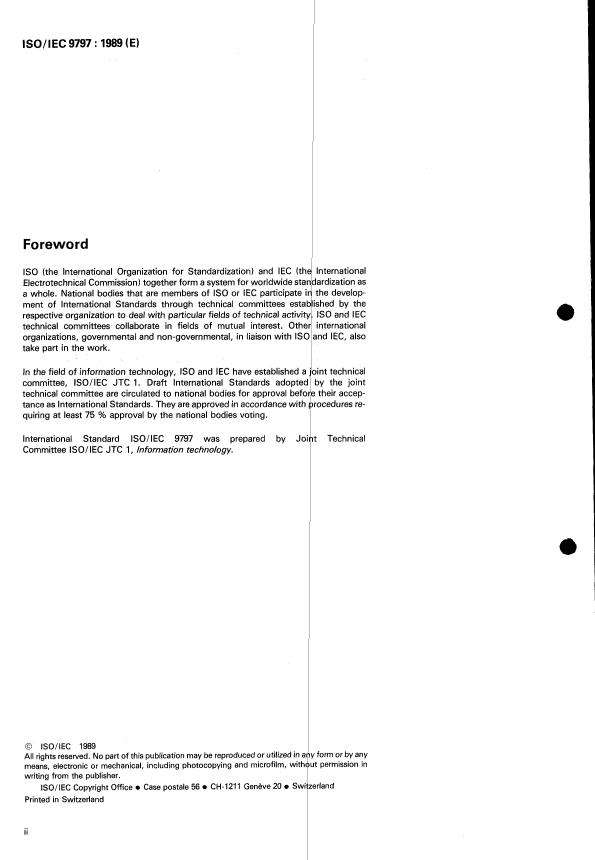 ISO/IEC 9797:1989 is a standard published by the International Organization for Standardization (ISO). Its full title is "Data cryptographic techniques — Data integrity mechanism using a cryptographic check function employing a block cipher algorithm". This standard covers: Data cryptographic techniques — Data integrity mechanism using a cryptographic check function employing a block cipher algorithm